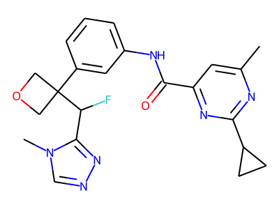 C[N]1C=NN=C1C(F)C2(COC2)C3=CC(=CC=C3)NC(=O)C4=NC(=NC(=C4)C)C5CC5