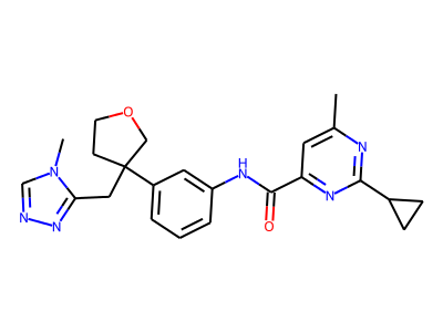 SMILES C[N]1C=NN=C1CC2(CCOC2)C3=CC=CC(=C3)NC(=O)C4=NC(=NC(=C4)C)C5CC5