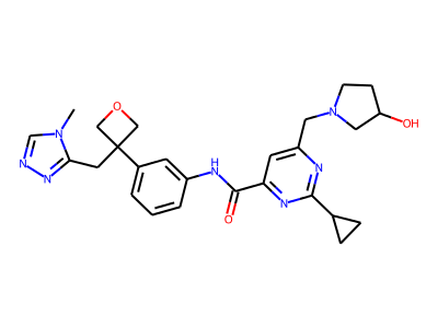 C[N]1C=NN=C1CC2(COC2)C3=CC=CC(=C3)NC(=O)C4=NC(=NC(=C4)CN5CCC(O)C5)C6CC6